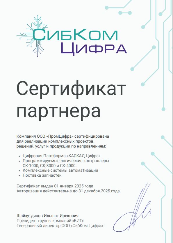 На базе договора о партнерстве от 2022 года ООО "ПромЦифра" и ООО "Сибком Цифра" продолжают успешное и взаимовыгодное партнерство в сфере промышленной автоматизации и цифровизации. Статус ООО "ПромЦифра" в качестве официального партнера ООО "Сибком Цифра" в области разработки ИТ-продуков для промышленности и систем управления подтвержден сертификатом партнера на 2025 год.