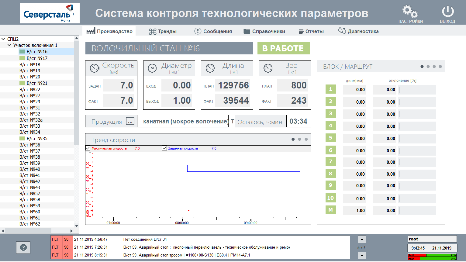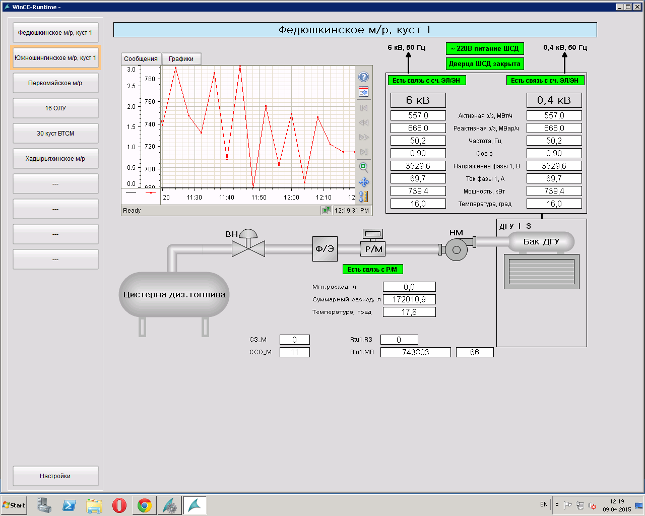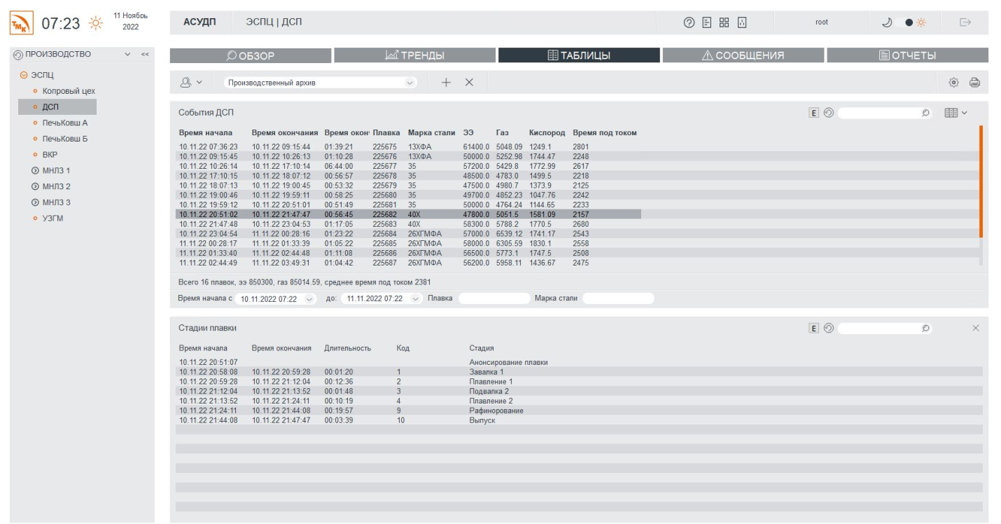 В системе реализован выбор и отображение на графики требуемых параметров, вывод списков сообщений со всего оборудования цеха.