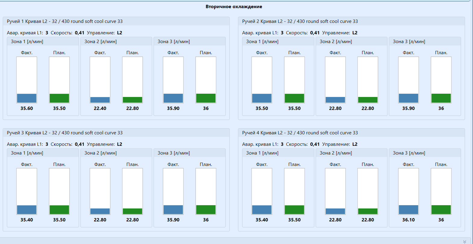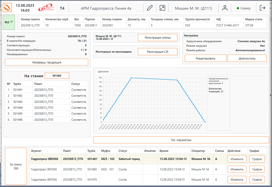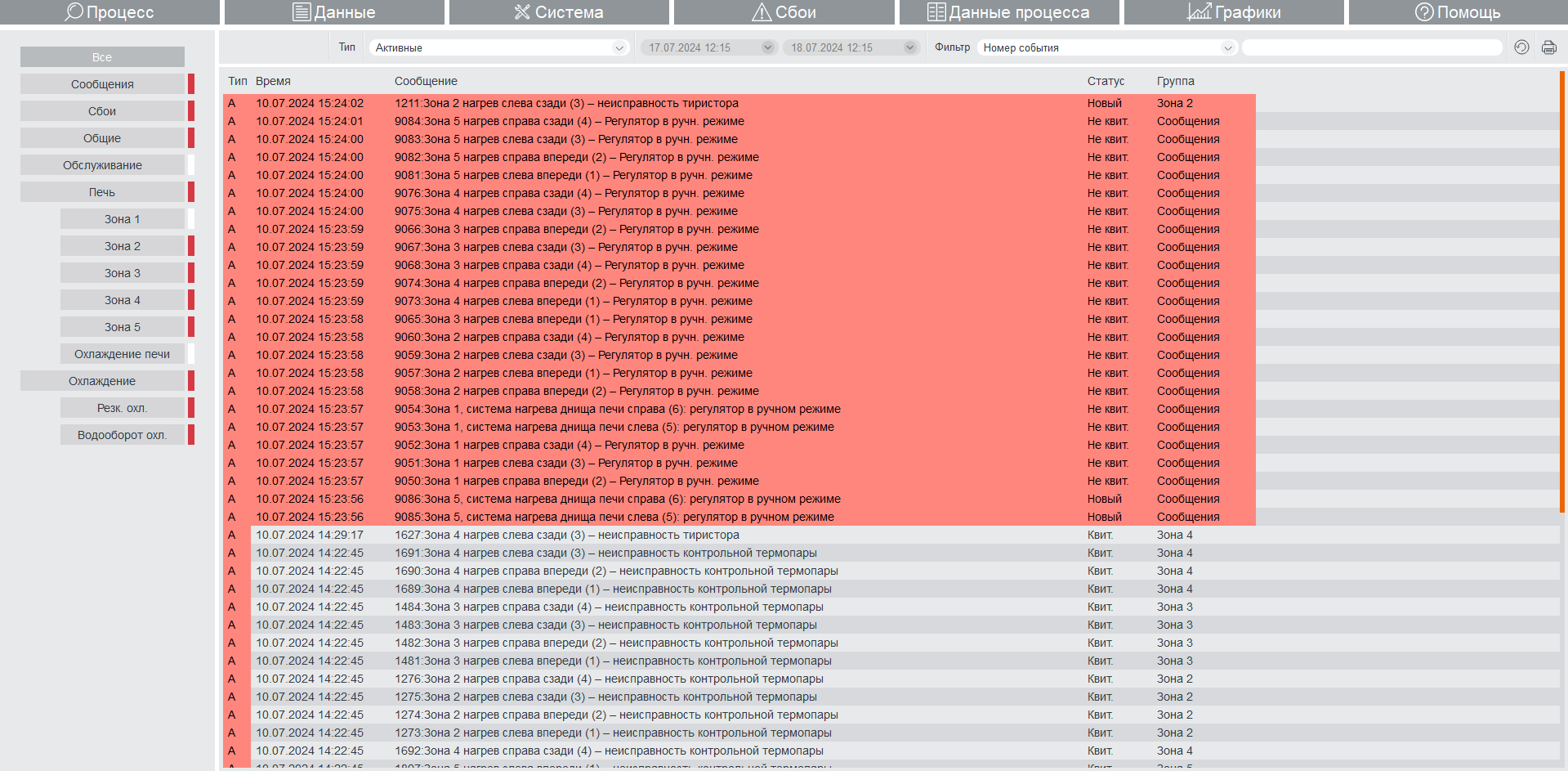 В системе реализован выбор и отображение на графики требуемых параметров, вывод списков сообщений со всего оборудования цеха.