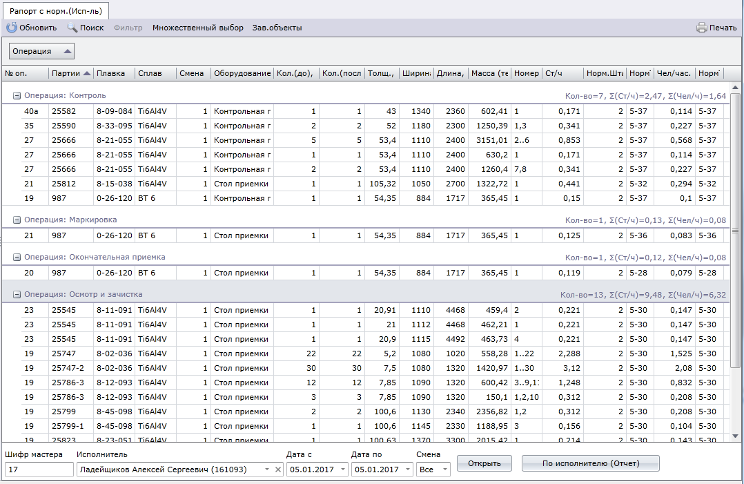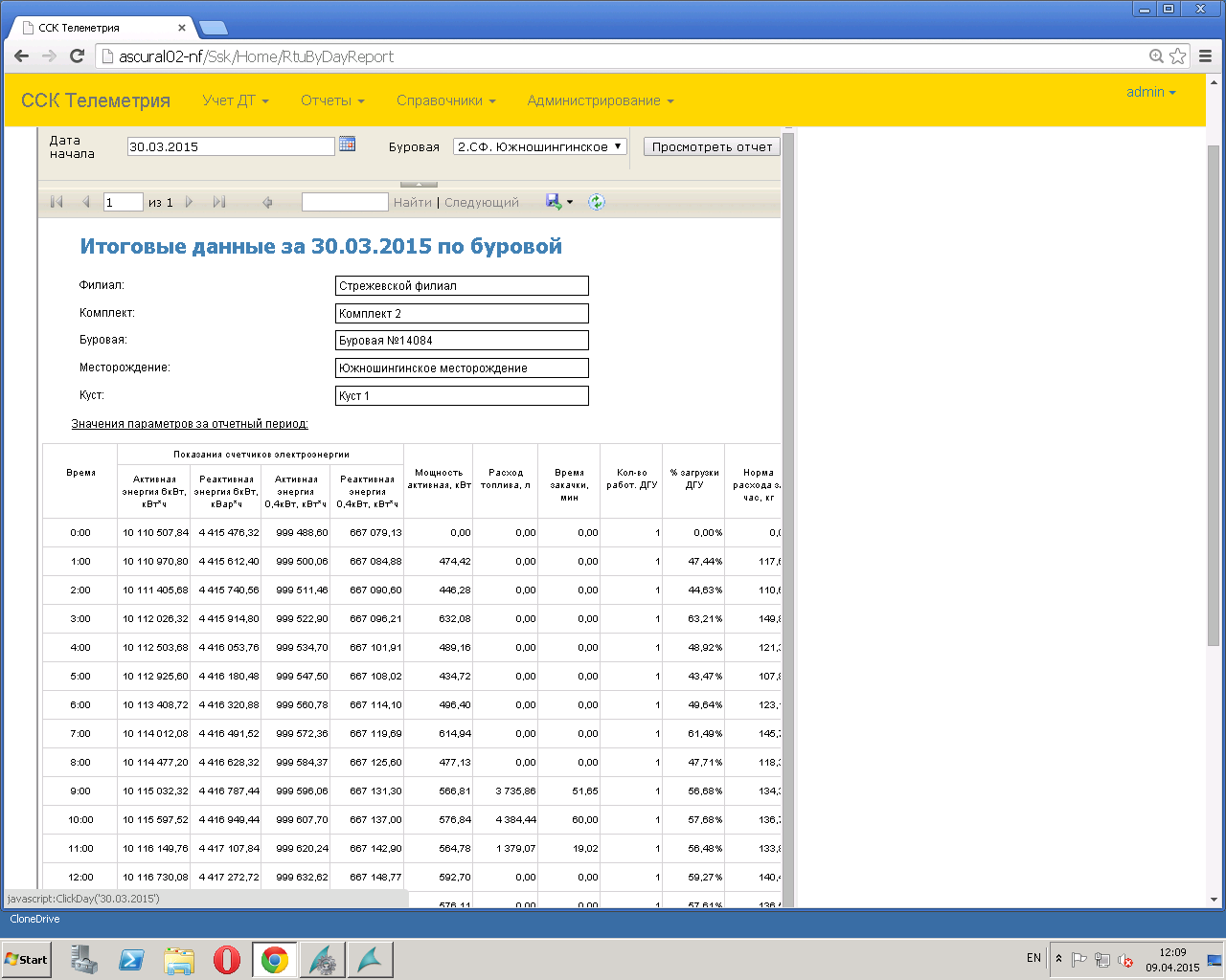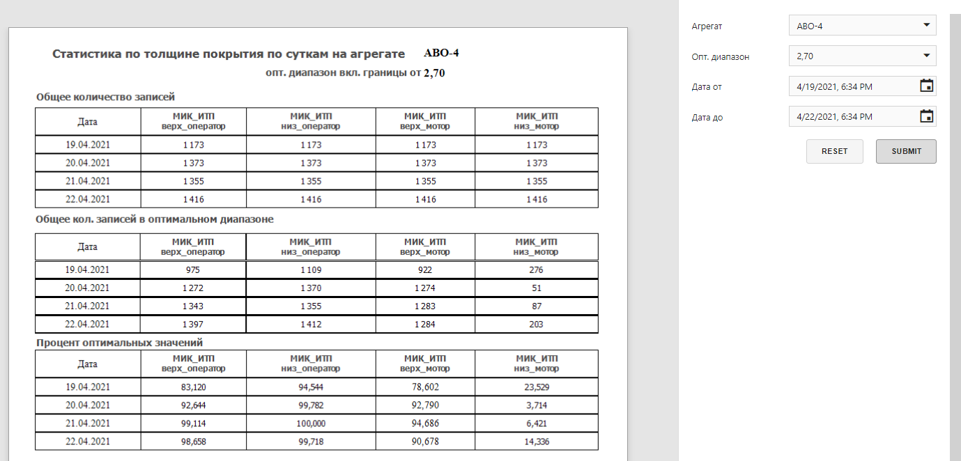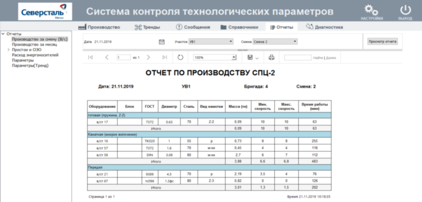 В системе реализована система отчетности, выводящая отчеты по производственным рапортам, простоям, расходам энергоресурсов.