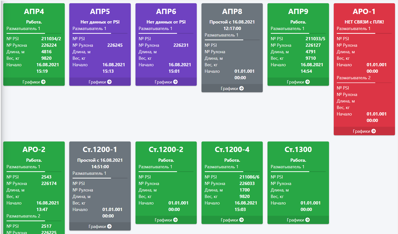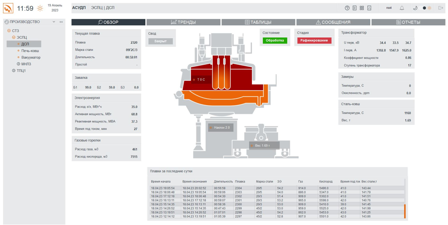 В системе отображается информация о состоянии оборудования, текущие значения параметров, информация о продукции, графики параметров, сообщения по выбранному агрегату.