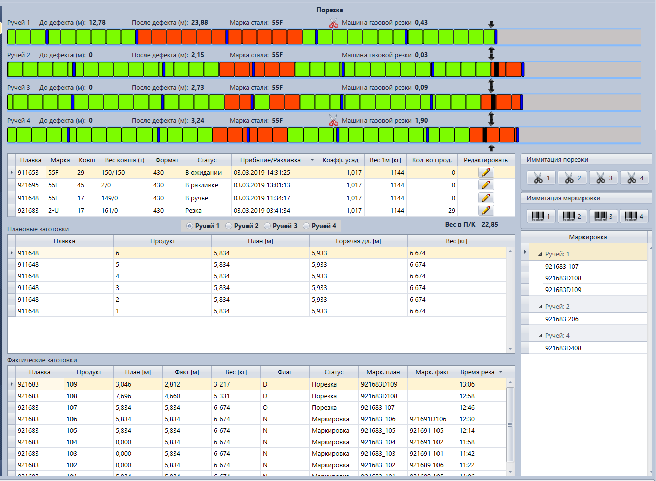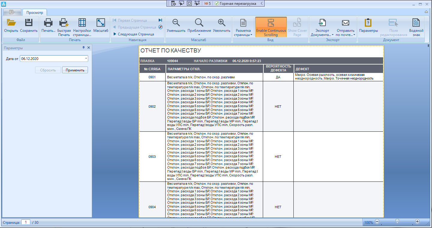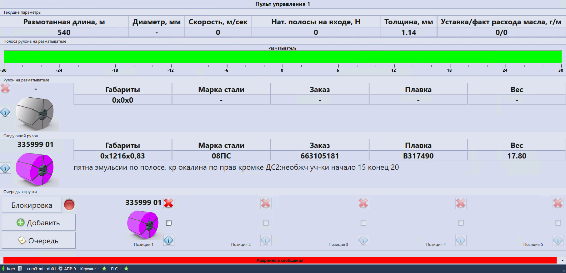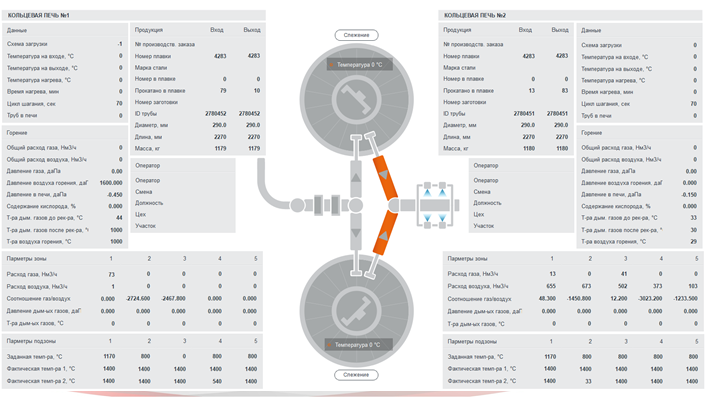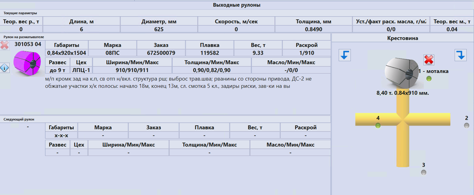 Система автоматически собирает информацию с датчиков, записывает в единую базу данных и хранит её. Это множество параметров по всем агрегатам основного производственного цикла: температура, скорость проката, толщина, вес рулона.