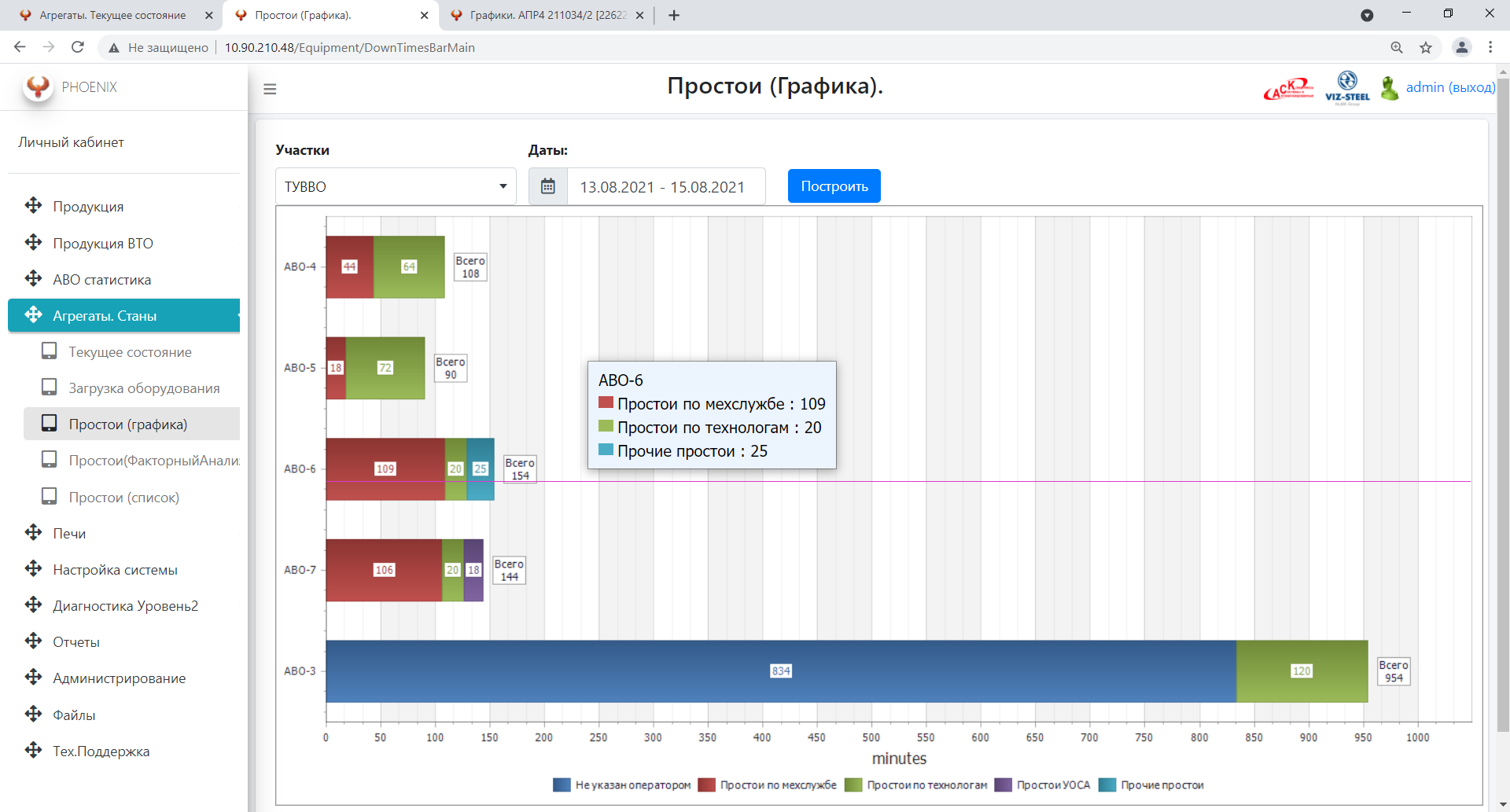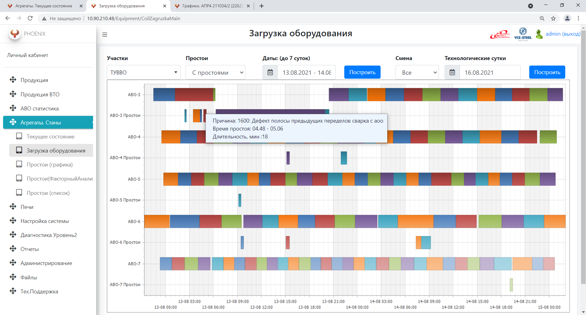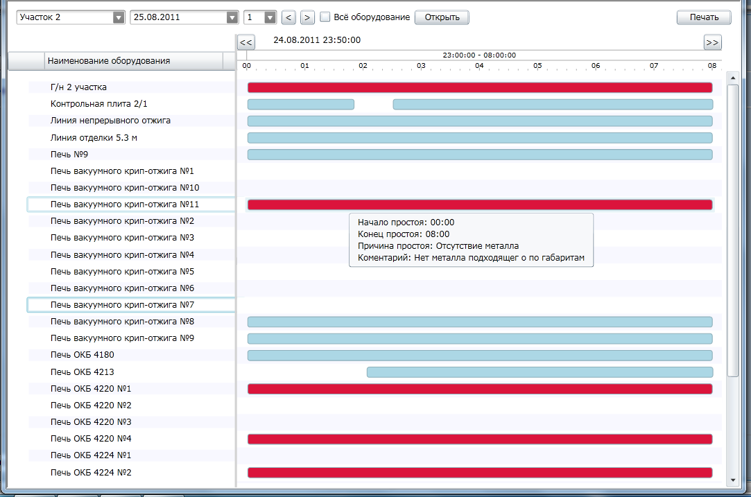 В системе выводятся временные диаграммы работы/простоев оборудования выбранного участка.