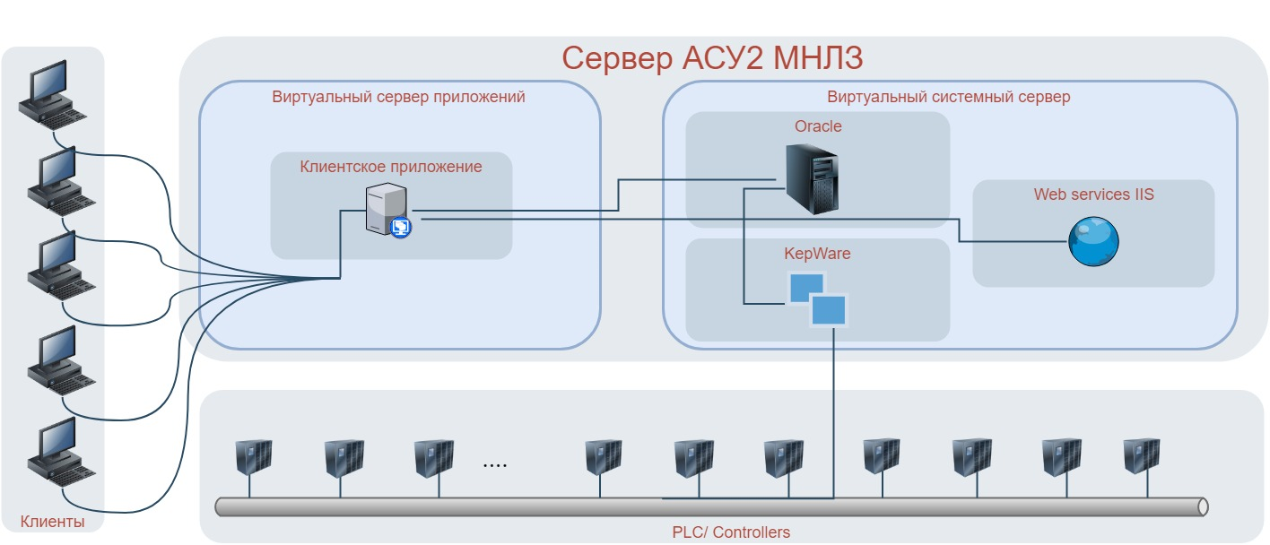 Все программное обеспечение АСУ Уровень2 развернуто на 1-м виртуальном сервере и 2-х виртуальных клиентских станциях с подключенными к ним тонкими клиентами на пультах управления печи.