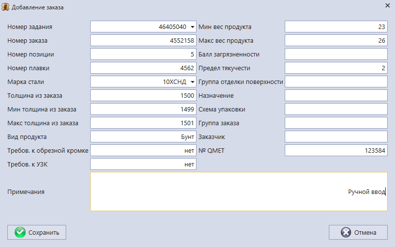 В системе реализован интерфейс ручного ввод информации о параметрах обрабатываемой продукции для каждого агрегата.